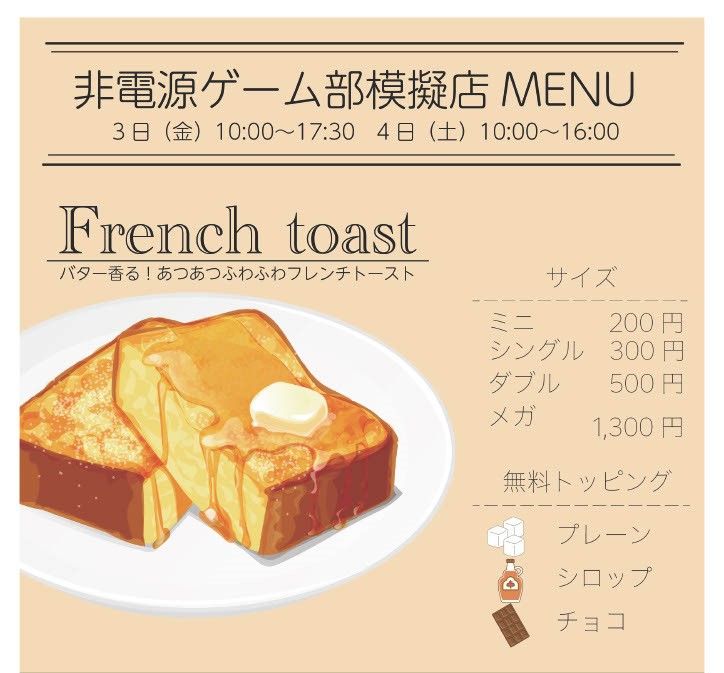 非電源ゲーム部の模擬店ではフレンチトーストを販売しています!この模擬店ではクーポン番号を伝えて50円引き!以下のトグルからクーポン番号を掲載しているのでチェック!