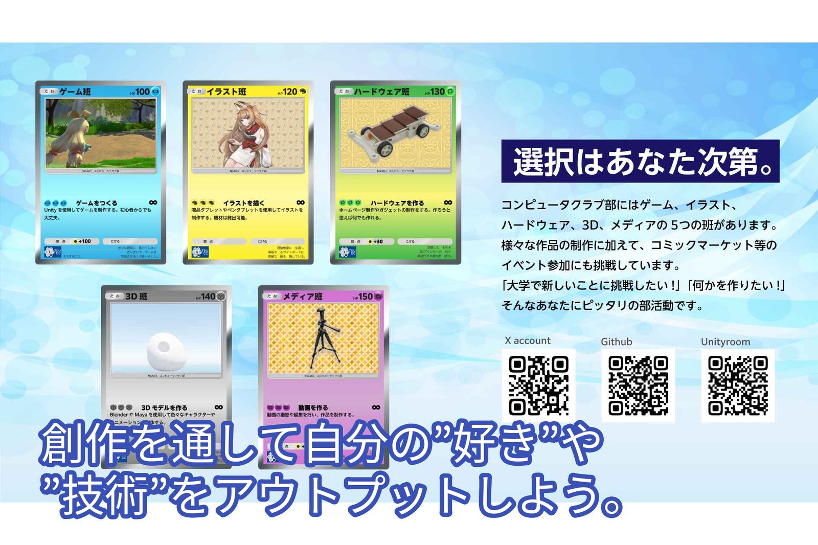 コンピュータクラブ部は現在、ゲーム・イラスト・3D・ハードウェア・メディア班の5つの班で活動しています。 それぞれ興味のある班に入班して講座や班制作を通して創作に打ち込めます。 初心者向け講座も充実しているので是非経験の有無を気にせず参加ください! 新歓でも制作体験など企画しているので、「作り始めるきっかけが...」と言った人も先輩達に相談しながら創作に打ち込めるので見学に来てください!👀 競プロやWebアプリ開発なども行っていますのでプログラミングやシステム開発に興味のある方の入部もお待ちしております。 VRや3Dプリンタ、mocopiなど個人では購入が難しい高額な機材なども備品として利用できます。