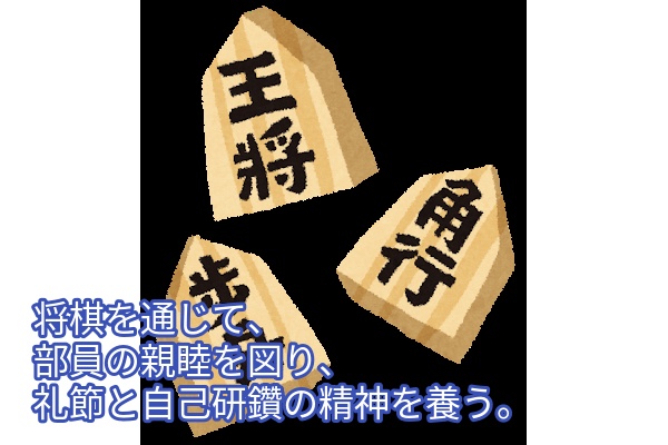 棋道部では将棋を通して思考力を養い、部員同士の親睦を深めています。勝敗のみを重視せず、のんびりと指すことを大切にしています。初心者から経験者まで、自分のペースで参加できます。