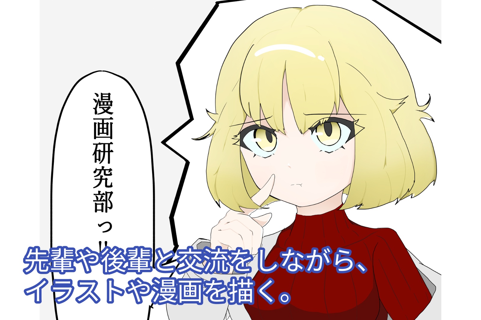 主に漫画を描くことが活動の主軸で、部内のみに共有される新入生歓迎号作成から、外部向けにはコミックマーケットの出展があります。この他の活動内容は、各個人が好きにイラストを描いたり、2025年現在はSNSを用いた部員同士の交流も行われています。