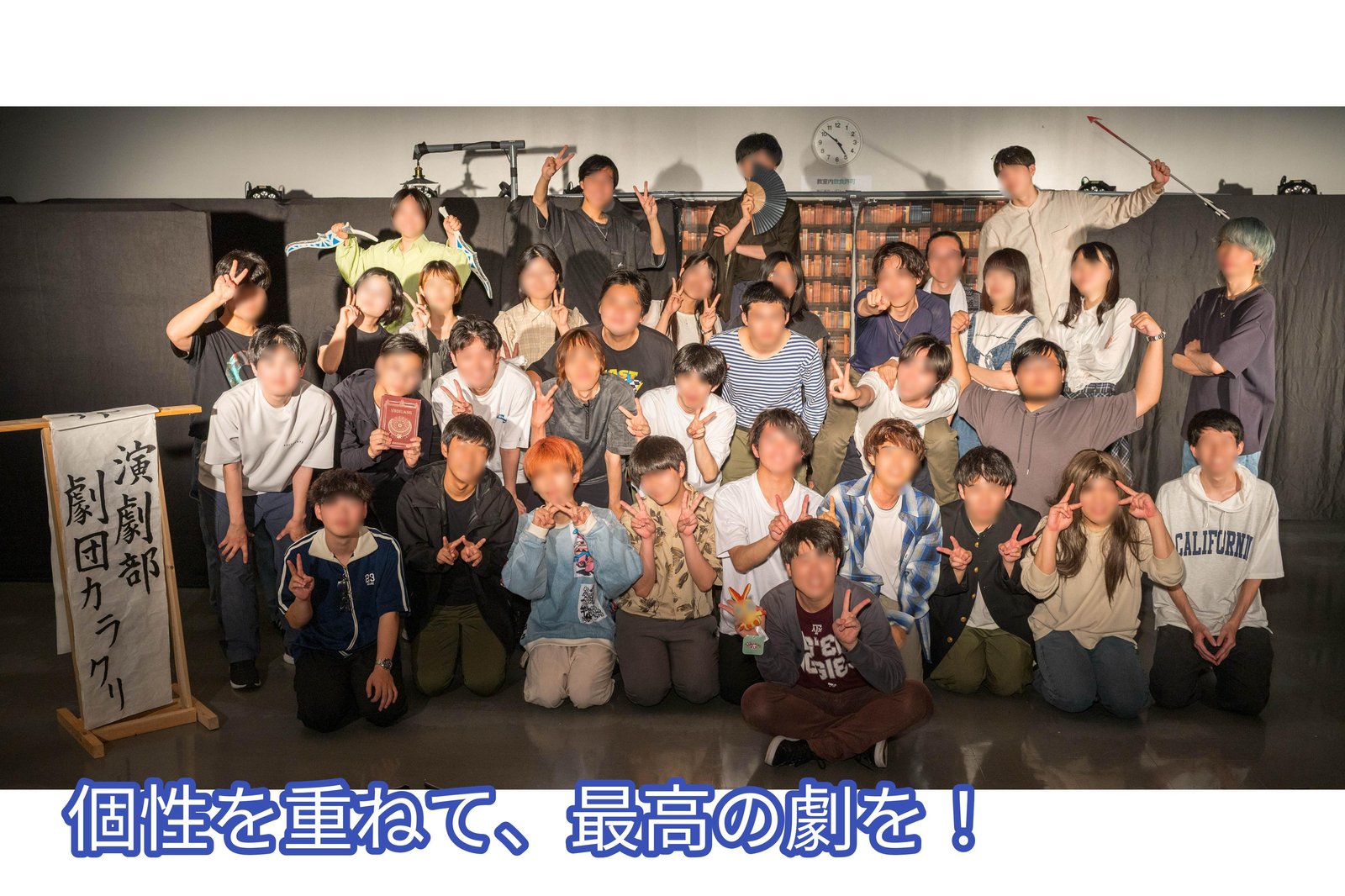 個性豊かな部員一人ひとりが輝ける場所です!役者だけでなく、照明・音響・小/大道具・脚本など多様な役職があるので、自分に合った関わり方で舞台づくりに挑戦できます!