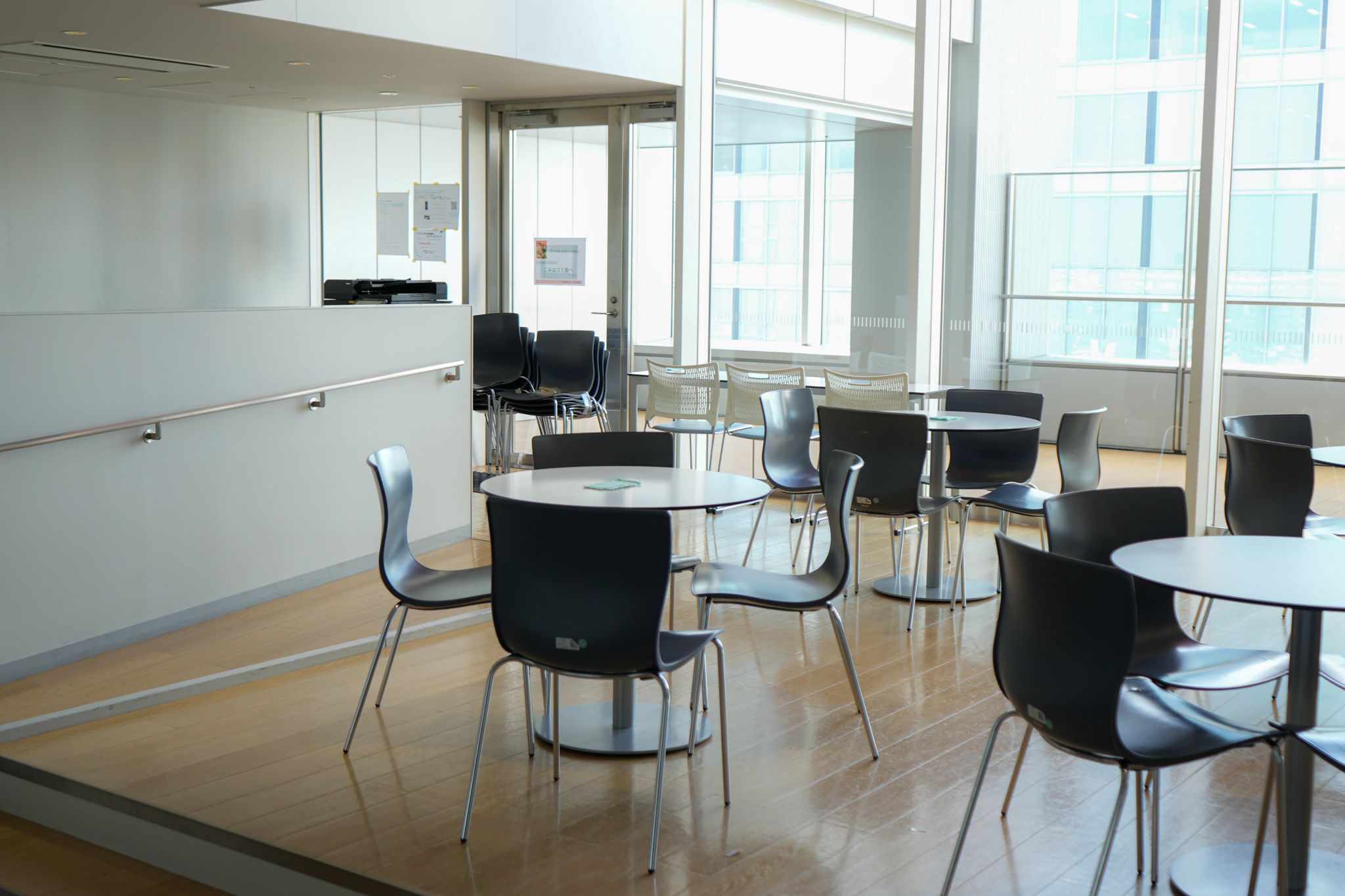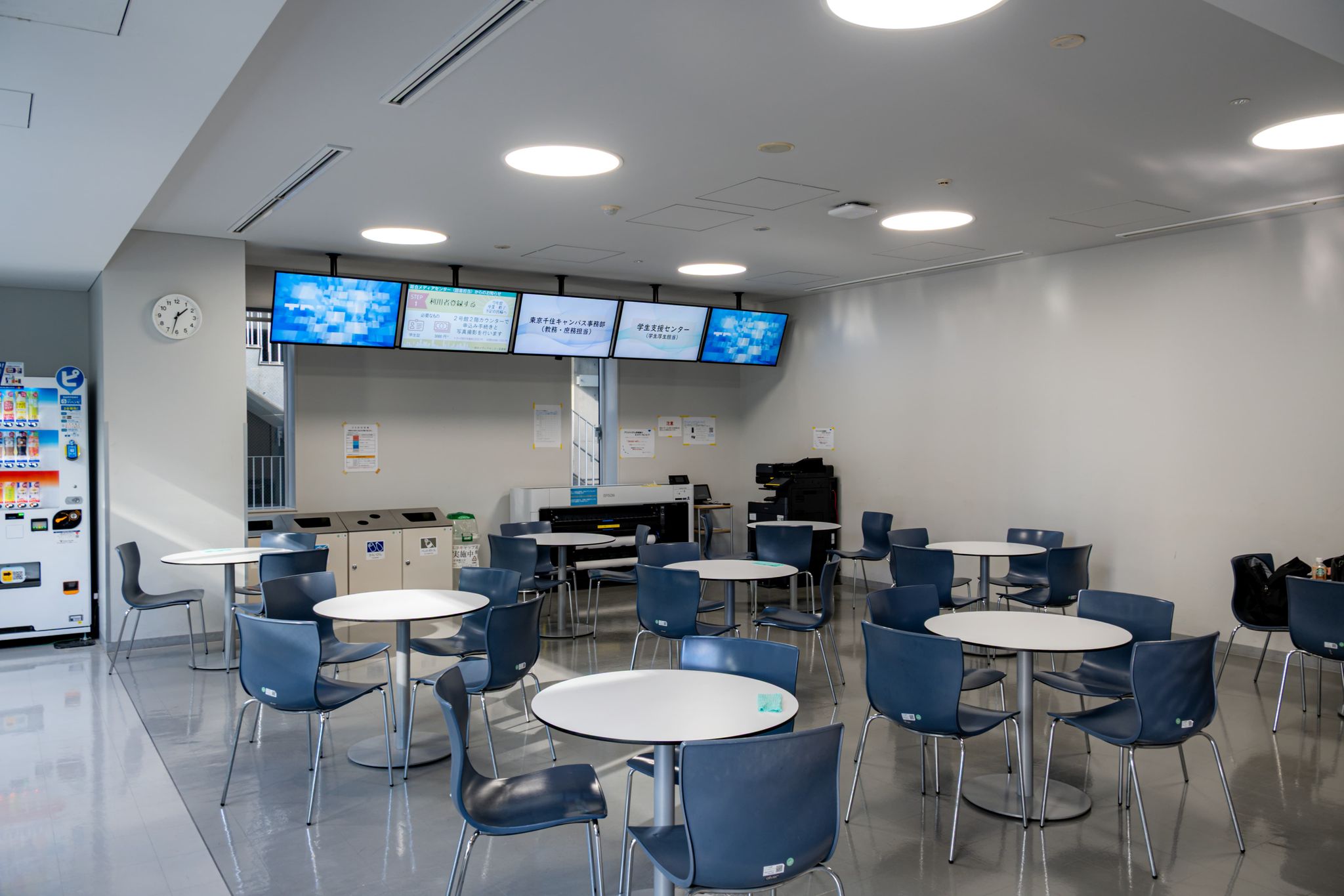 こちらにも自動販売機があり、このラウンジでは数種類のプリンター(複合機)が設置されており、印刷を行いながら食事をして待つのもいいだろう。