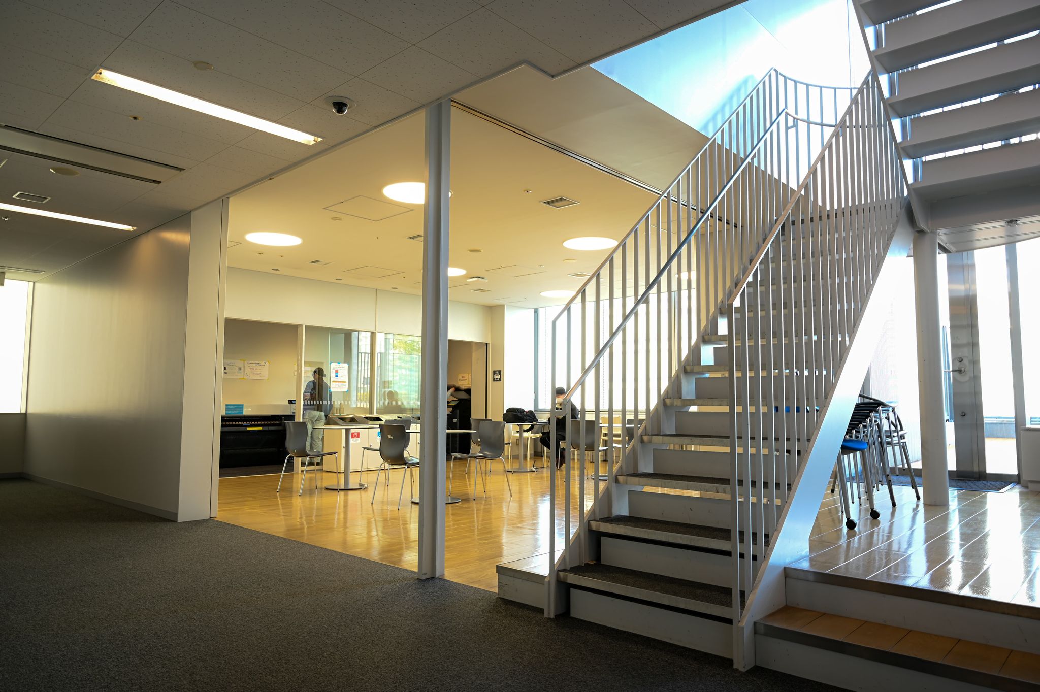 ここはアクセスこそ悪いものの、奥にルーフガーデンがある。空きコマの時などに間食をつまみながら作業をして、気分転換にルーフガーデンでのんびりするなどの使い方が出来る。